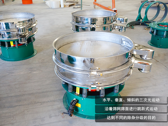 橡膠粉一般分為粗膠粉0.425mm(40目)以上、細膠粉0.425mm—0.180(40—80目)、微細膠粉0.180—0.075mm(80—200目)。DH系列旋振篩通過立式振動電機作為振動源,在篩分過程中將電機的旋轉(zhuǎn)運動轉(zhuǎn)變?yōu)樗?、垂直、傾斜的三次元運動,再把這個運動傳遞給上端的篩面進行橡膠粉篩分。將篩分的橡膠粉沿著篩網(wǎng)篩面進行跳躍式運動,再通過篩面上不同尺寸大小的網(wǎng)孔分級過網(wǎng),以達到不同的除雜分級的目的。篩網(wǎng)層數(shù)高可達到5層,可滿足不同規(guī)格的分級除雜。