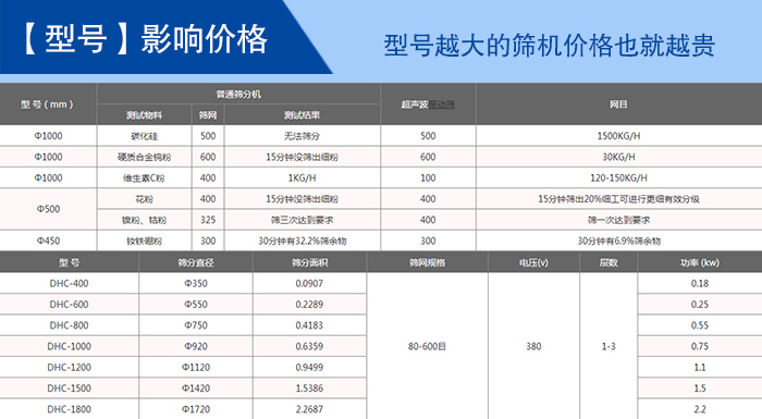 超聲波篩分機型號有:DHC-400、DHC-600、DHC-800、DHC-1000、DHC-1200、DHC-1500、DHC-1800、DHC-2000等八種標準直徑型號;不同型號的超聲波篩分機的價格就是不同,其中影響型號的的因素有:篩網(wǎng)(1—5層)、材質(zhì)(不銹鋼、碳鋼)、振動電機(功率不同)等。
