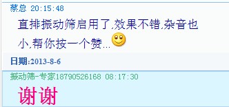 您好,得知您購(gòu)買(mǎi)我們的ZPS-800型直排篩現(xiàn)已投入到生產(chǎn)中,并且效果很好,雜音也很小,為此向你祝賀。我們大漢公司生產(chǎn)的一系列振動(dòng)篩,振動(dòng)振動(dòng)篩,直排篩,試驗(yàn)篩,拍擊篩,氣流篩因做工扎實(shí),質(zhì)量可靠而受到廣大客戶(hù)的稱(chēng)贊。
