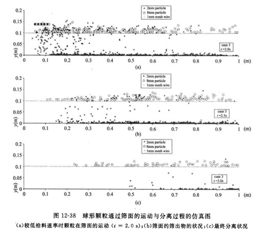 DEM仿真的過程信息能夠在線不同篩分工作條件下顆粒再篩面的運動、顆粒同篩面之間的碰撞過程、顆粒通過篩網(wǎng)的分離過程,反映了不同力度顆粒在篩面上運動形態(tài)的差異,再現(xiàn)不同振動篩分機工作條件下顆粒運動過程,較為真實的描述顆粒同篩面之間的碰撞過程。圖12-38為Li等人模擬2mm和8mm球形顆粒通過篩面的運動與分離過程圖。